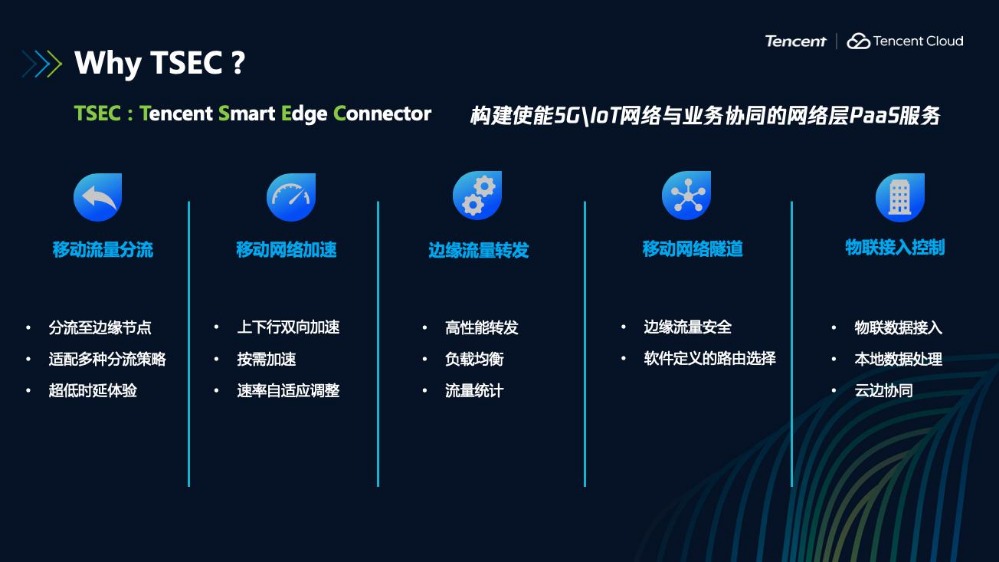 騰訊TSEC致力于構(gòu)建使能5G/IoT網(wǎng)絡(luò)與業(yè)務(wù)協(xié)同的網(wǎng)絡(luò)層PaaS服務(wù),具備移動(dòng)流量分流、移動(dòng)網(wǎng)絡(luò)加速、邊緣流量轉(zhuǎn)發(fā)、移動(dòng)網(wǎng)絡(luò)隧道、物聯(lián)接入控制等核心功能。作為5G網(wǎng)絡(luò)與業(yè)務(wù)的橋梁,TSEC豐富的移動(dòng)組件可以連接移動(dòng)用戶(hù)、運(yùn)營(yíng)商5G網(wǎng)絡(luò)和應(yīng)用,為高價(jià)值用戶(hù)和業(yè)務(wù)提供可自定義的、高質(zhì)量的、差異化的邊緣計(jì)算網(wǎng)絡(luò)服務(wù),實(shí)現(xiàn)應(yīng)用在云、邊、端的友好協(xié)同。