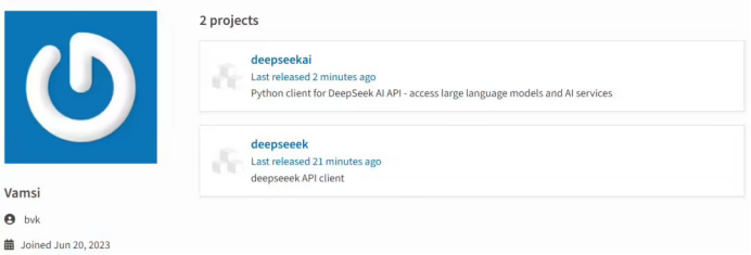 2025 年 1 月 29 日,用戶 bvk(該賬戶于 2023 年 6 月創(chuàng)建,且無其他活動記錄)在 Python 軟件包索引(PyPI)上傳了兩個軟件包:“deepseeek”和“deepseekai”。
