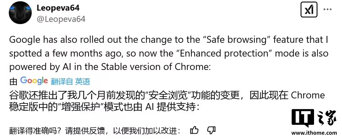 IT之家 2 月 17 日消息,消息源 @Leopeva64 昨日(2 月 16 日)在 X 平臺(tái)發(fā)布推文,稱在經(jīng)過(guò) 3 個(gè)月的 Canary 頻道測(cè)試后,谷歌 Chrome 瀏覽器穩(wěn)定版已全平臺(tái)上線全新“增強(qiáng)保護(hù)”(Enhanced protection)功能,在現(xiàn)有功能基礎(chǔ)上,通過(guò) AI 實(shí)時(shí)防護(hù)危險(xiǎn)網(wǎng)站、下載和擴(kuò)展程序等。